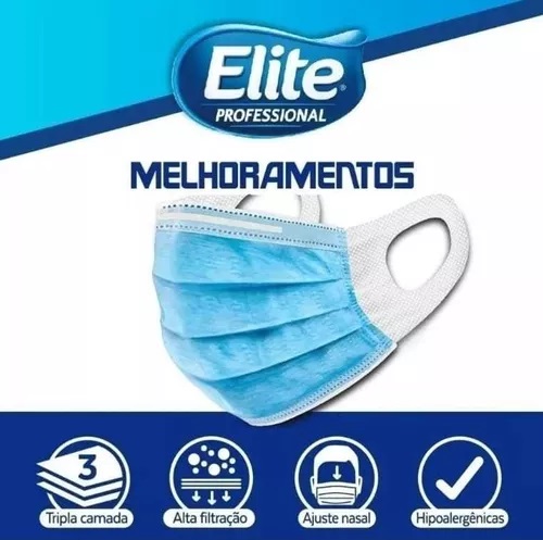As máscaras cirúrgicas Elite Professional tem tripla camada de proteção e orelha de TNT Elastizado garantindo altíssimo conforto, com boa sensação e segurança de uso. Possui alta resistência à seco e à úmido e é suave na pele e não irrita. Material TNT do tipo SMS com gramaturas 20/50/20 (g/m2), o que resulta em produto com alta eficiência na filtração de bactérias e partículas. Tem clip nasal para melhor ajuste e vedação no rosto.